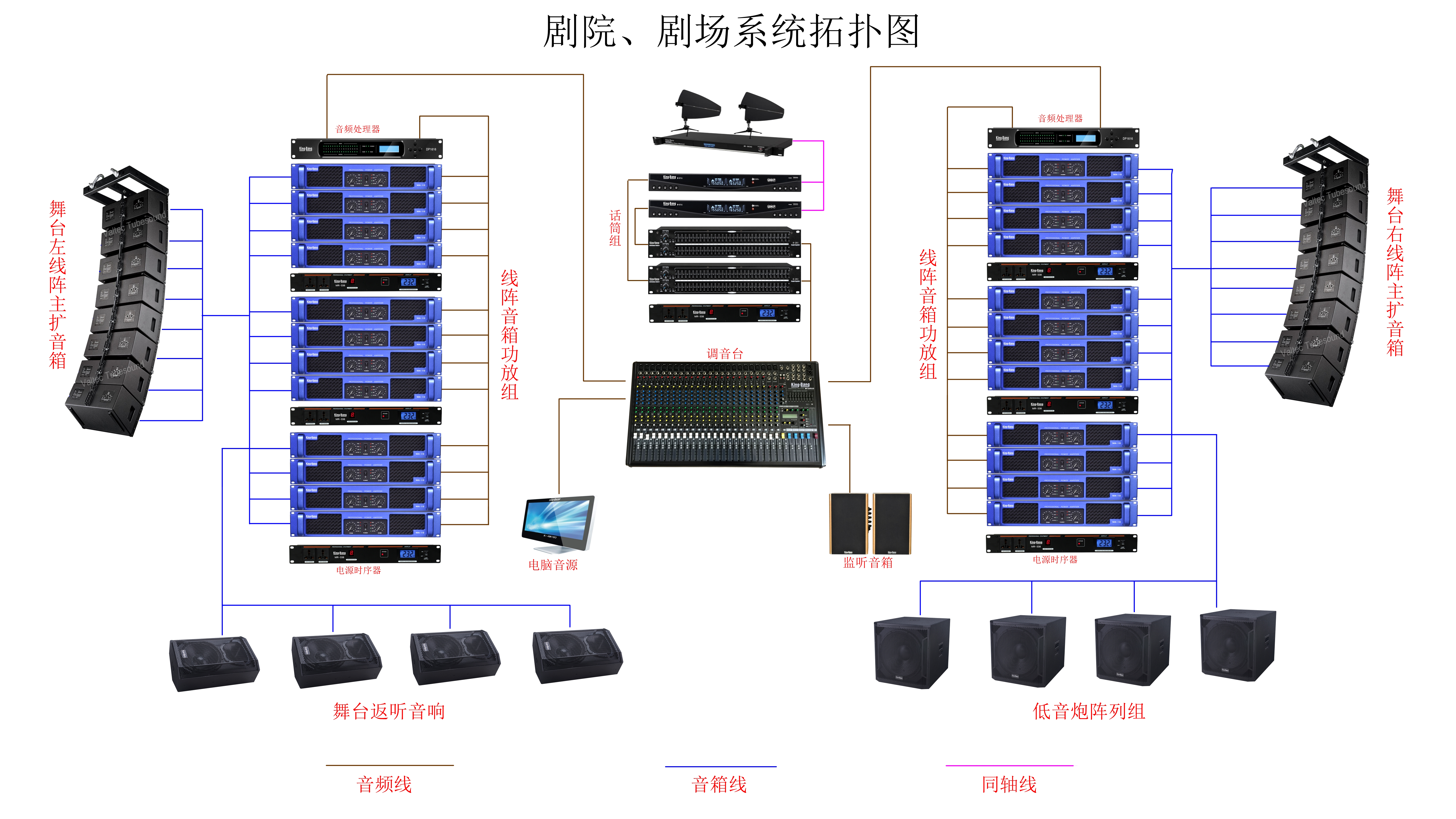 劇院的觀眾廳擴(kuò)聲系統(tǒng),舞臺返送監(jiān)聽系統(tǒng),以及控制室監(jiān)聽系統(tǒng)。